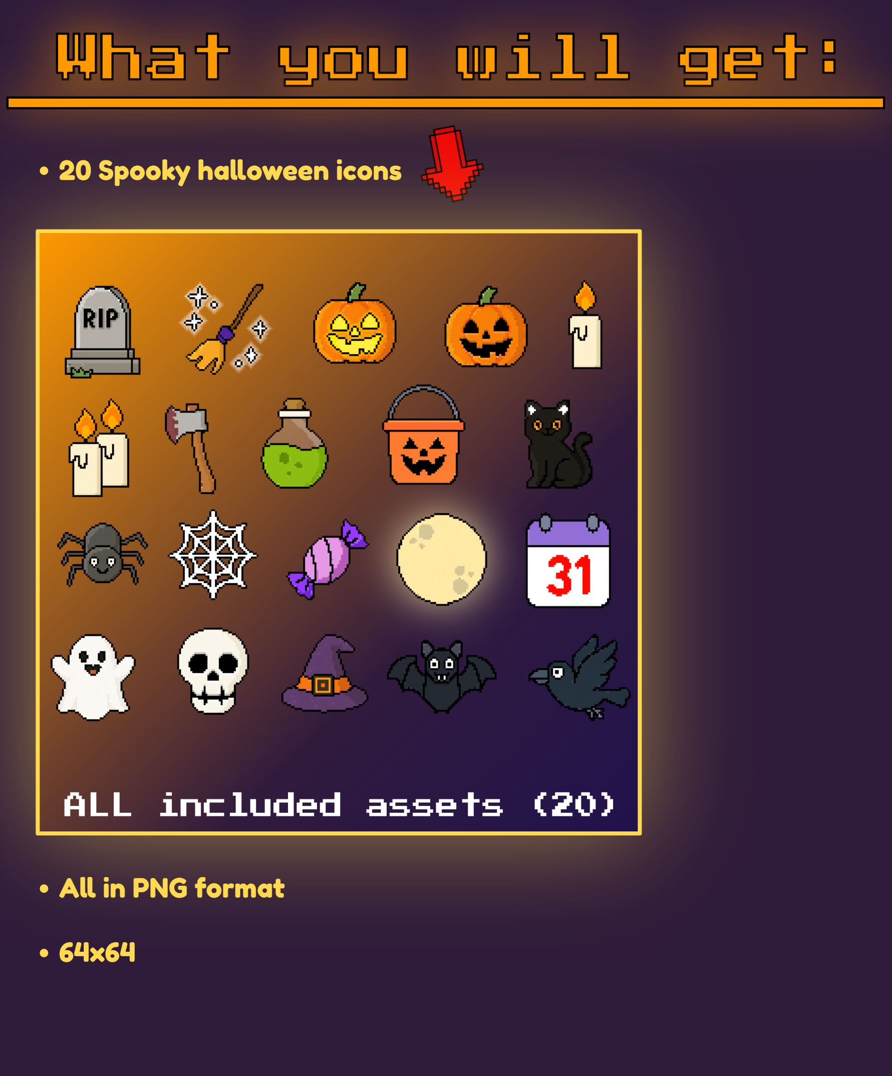 | Tags | 64x64, Asset Pack, free, Halloween, Horror, Icons, Pixel Art, pixelated, Sprites, User Interface (UI) |