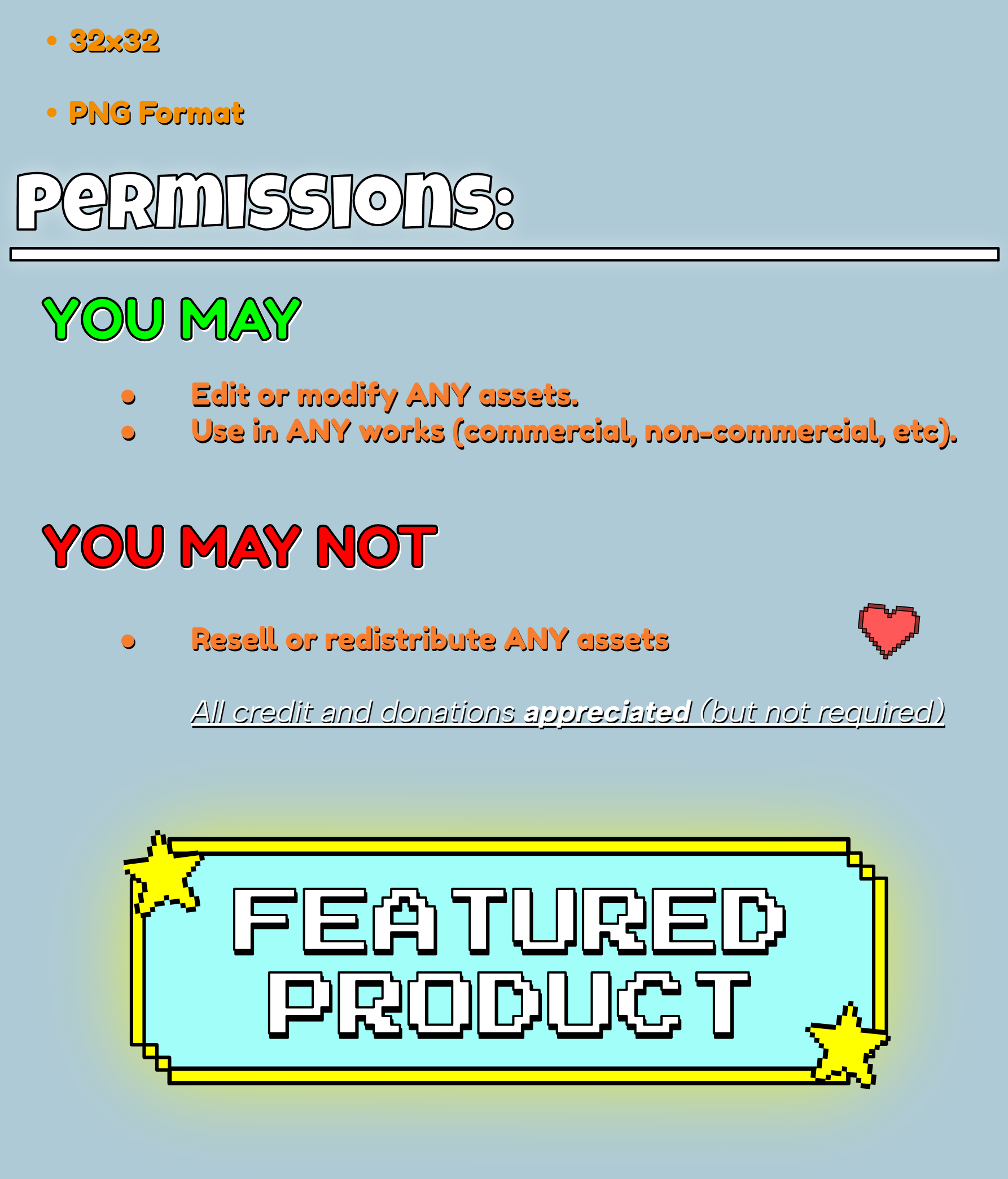 | Tags | 2D, 32x32, Asset Pack, free, Pixel Art, Royalty Free, seamless, Sprites, Textures, User Interface (UI) |